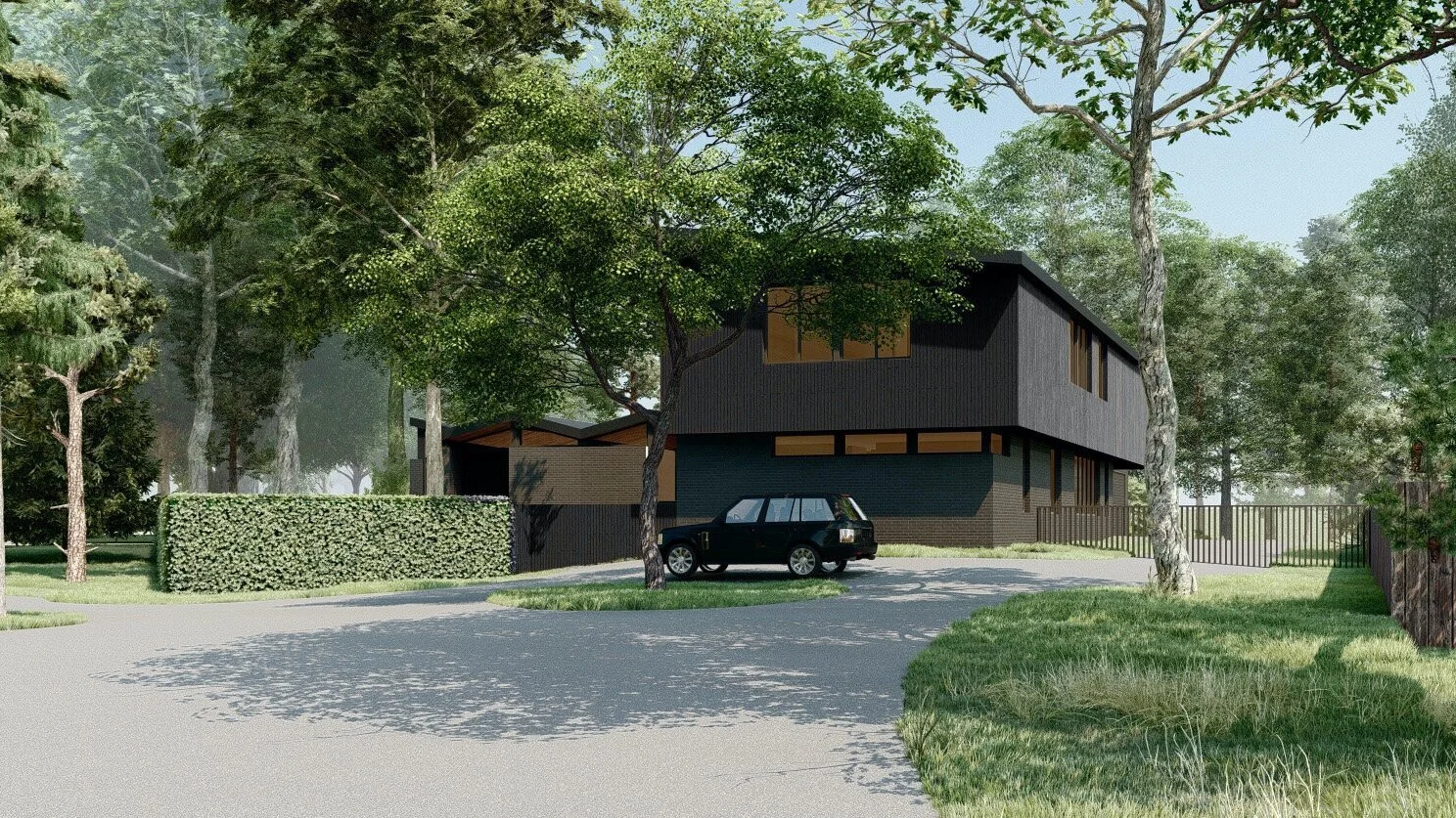 This new 8,000sqft residence is our first project in the Midwest region. The 2-story family home features a folded roof and floor to ceiling glazing which connects to and embraces the wooded property around it.