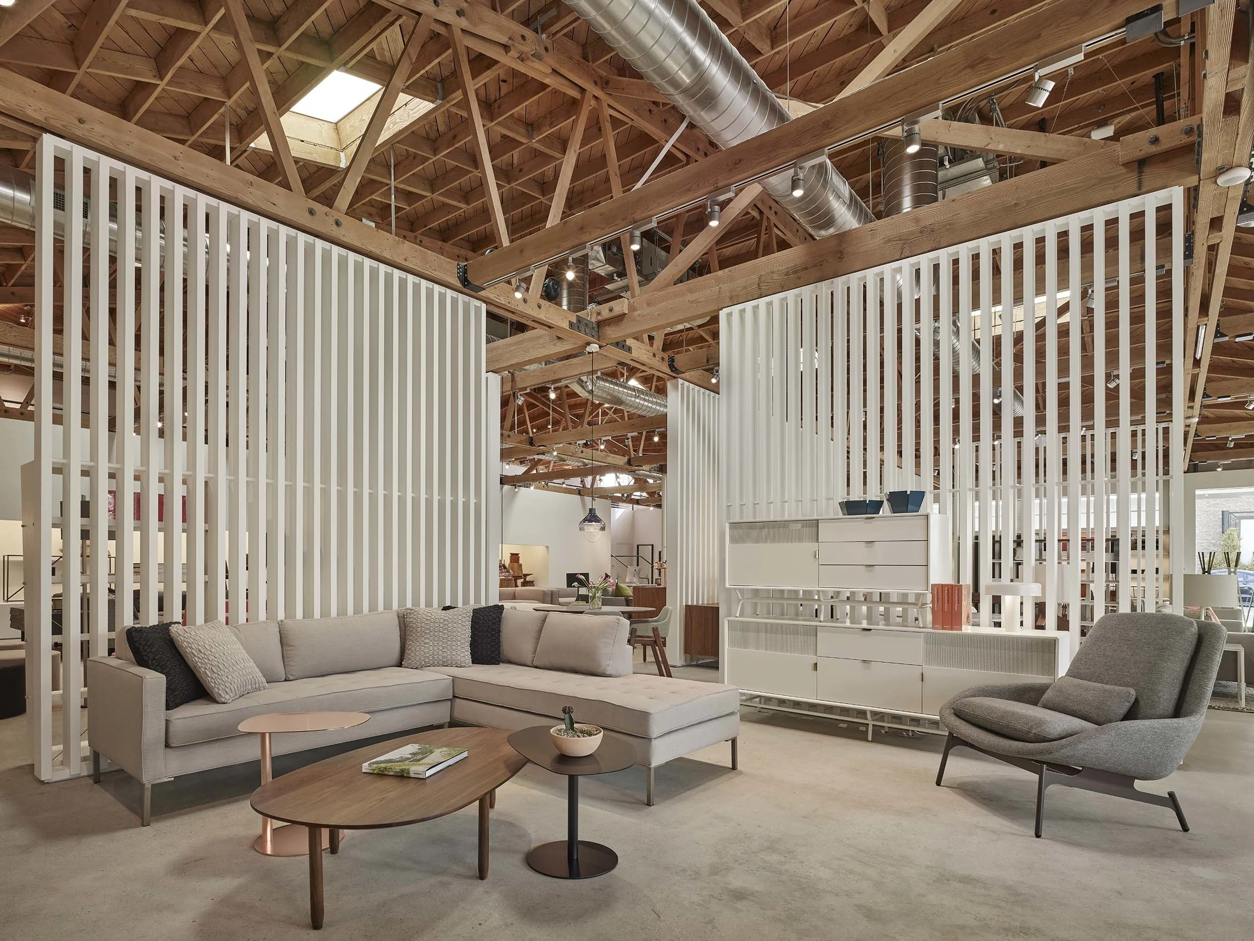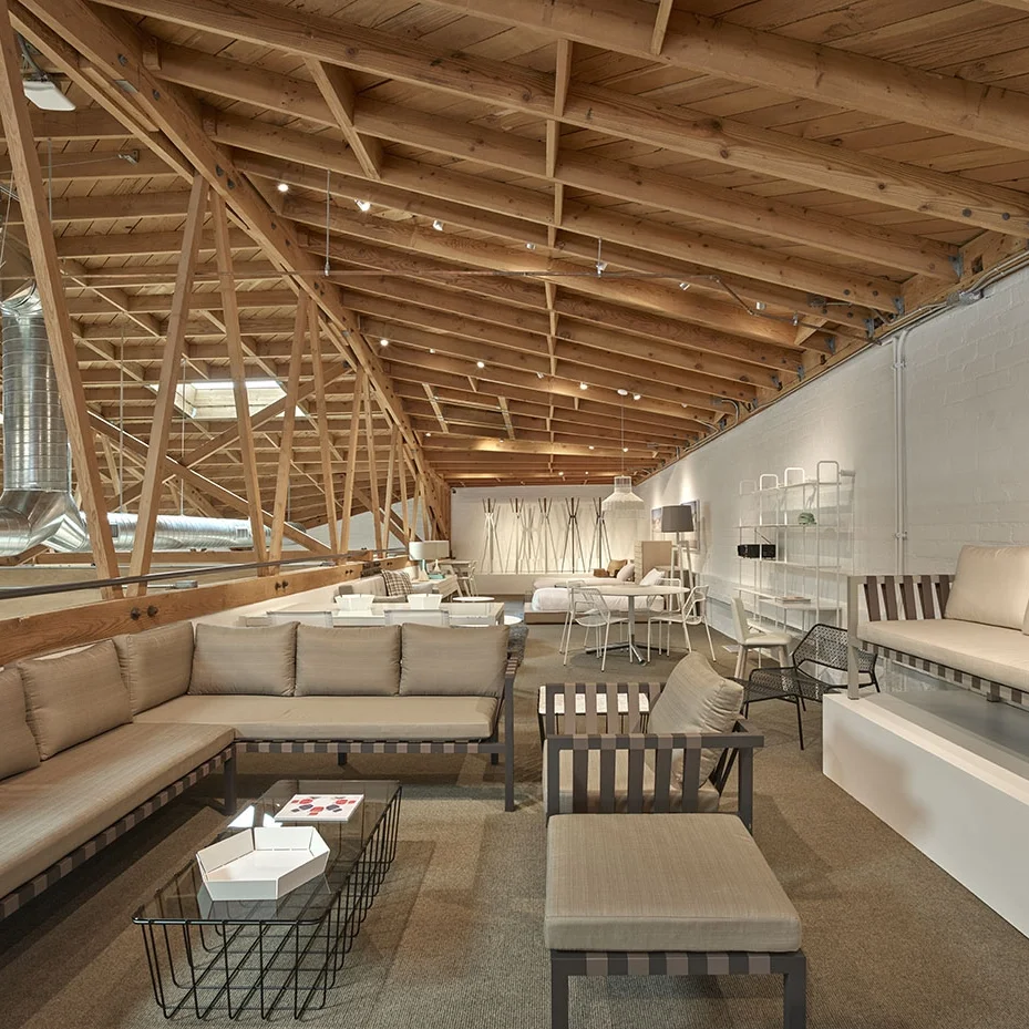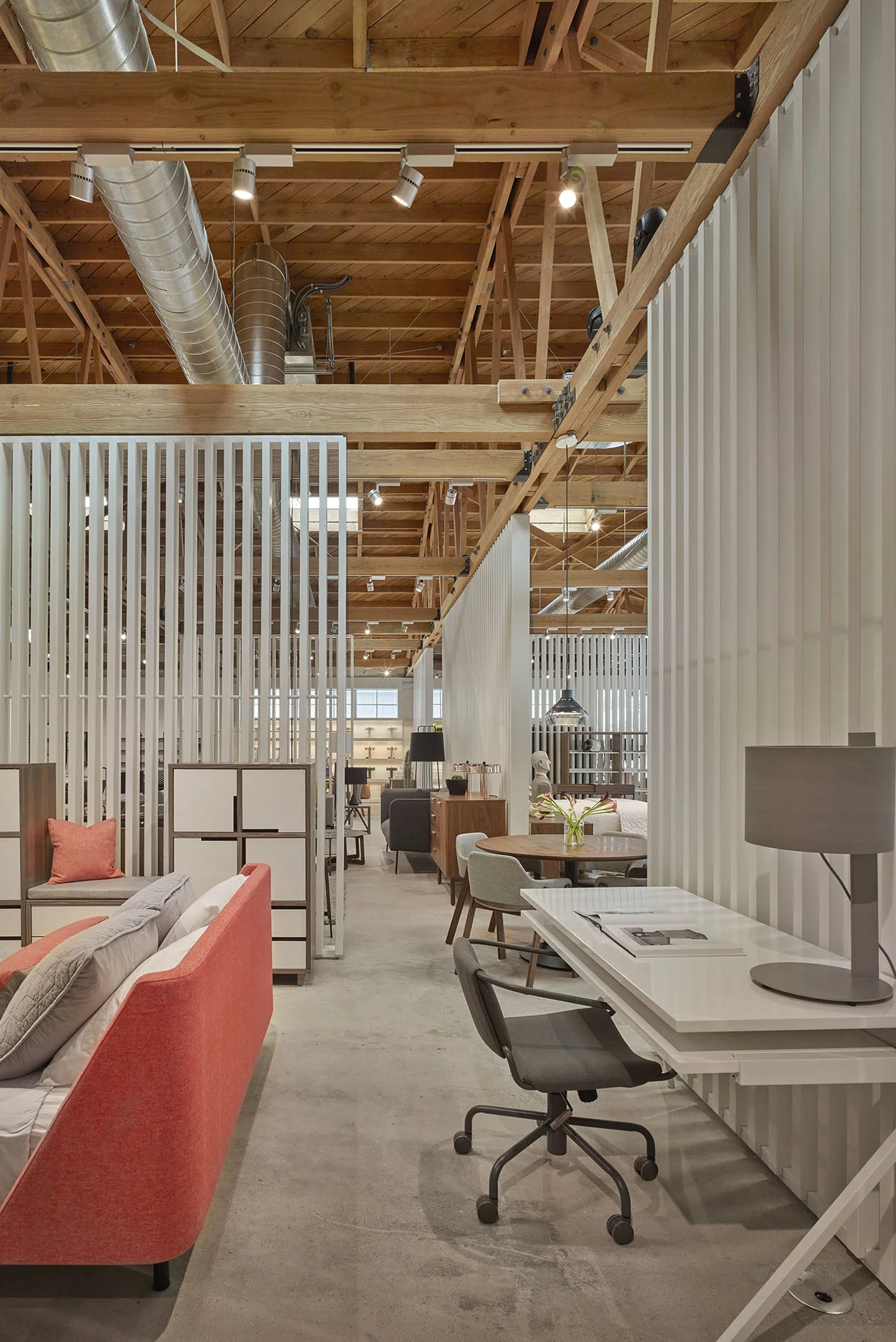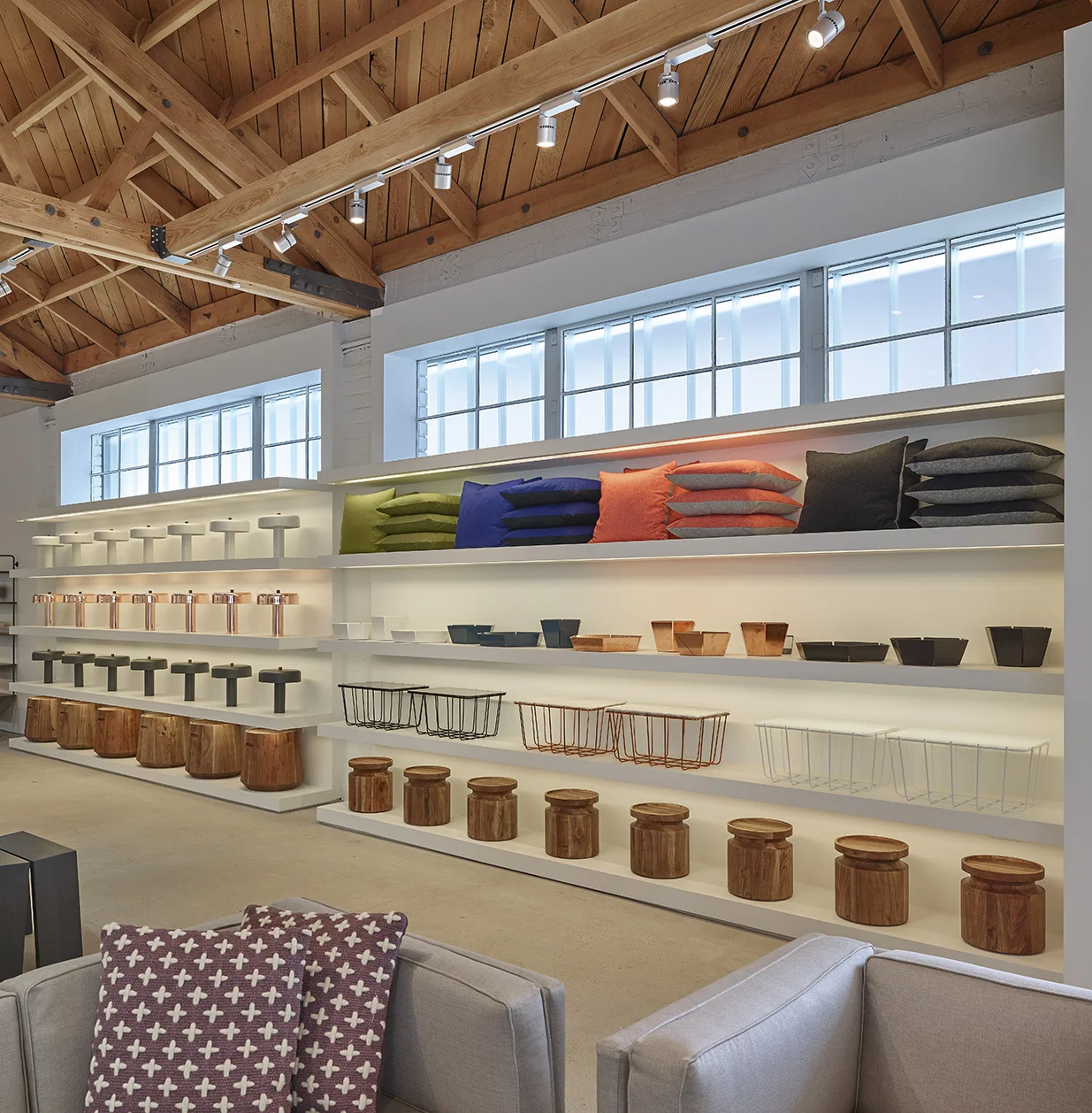 Inside the 5,000-square-foot retail space, vertical slatted screens frame intimately scaled vignettes and create dynamic and free-flowing spaces. Rhythmically staggered beams span between the existing bowstring trusses to provide lighting throughout. At the perimeter of the space, indirectly lit display shelves and a recessed display niche line the walls. A new walnut cold stair invites customers to the mezzanine.