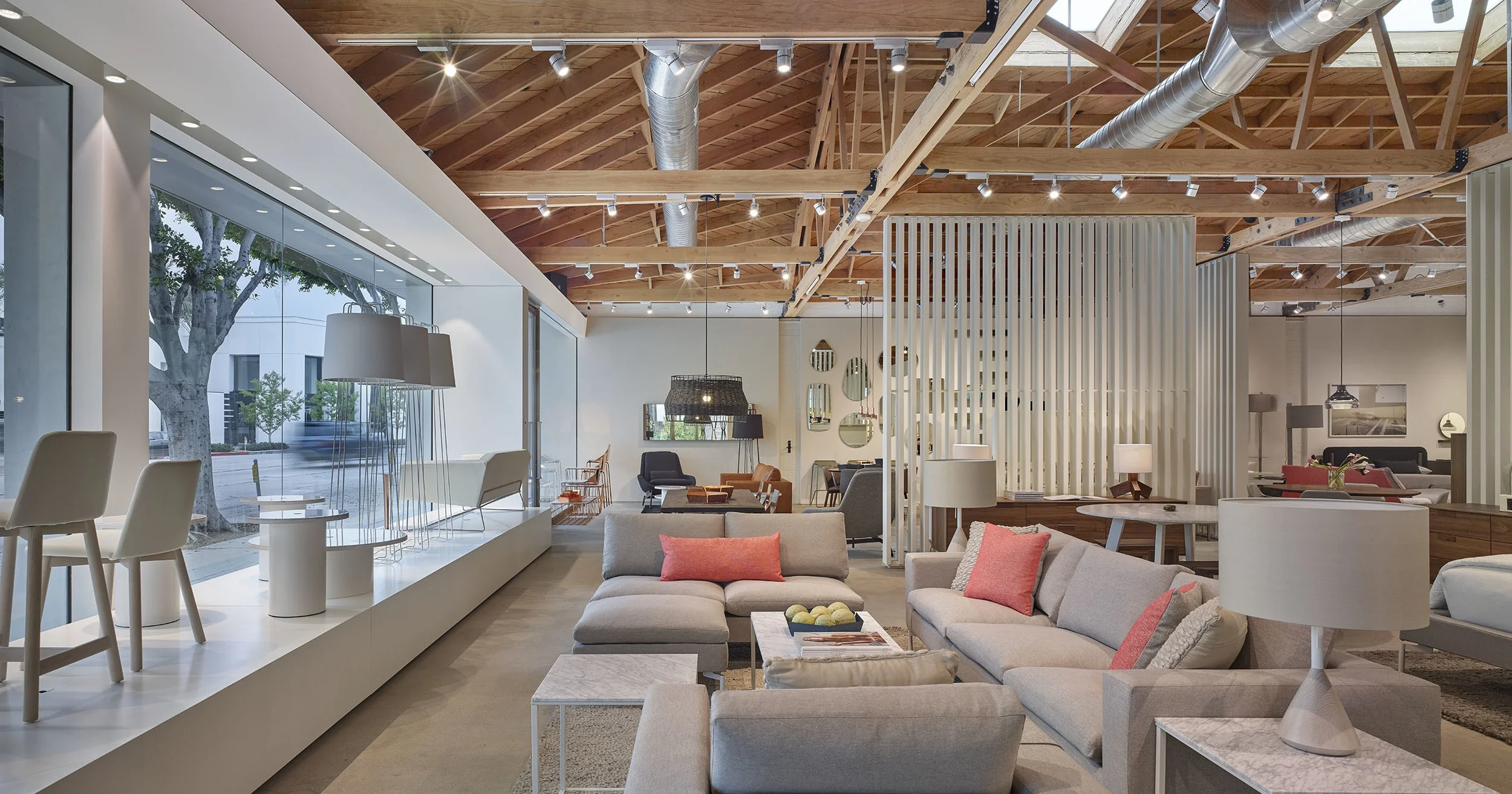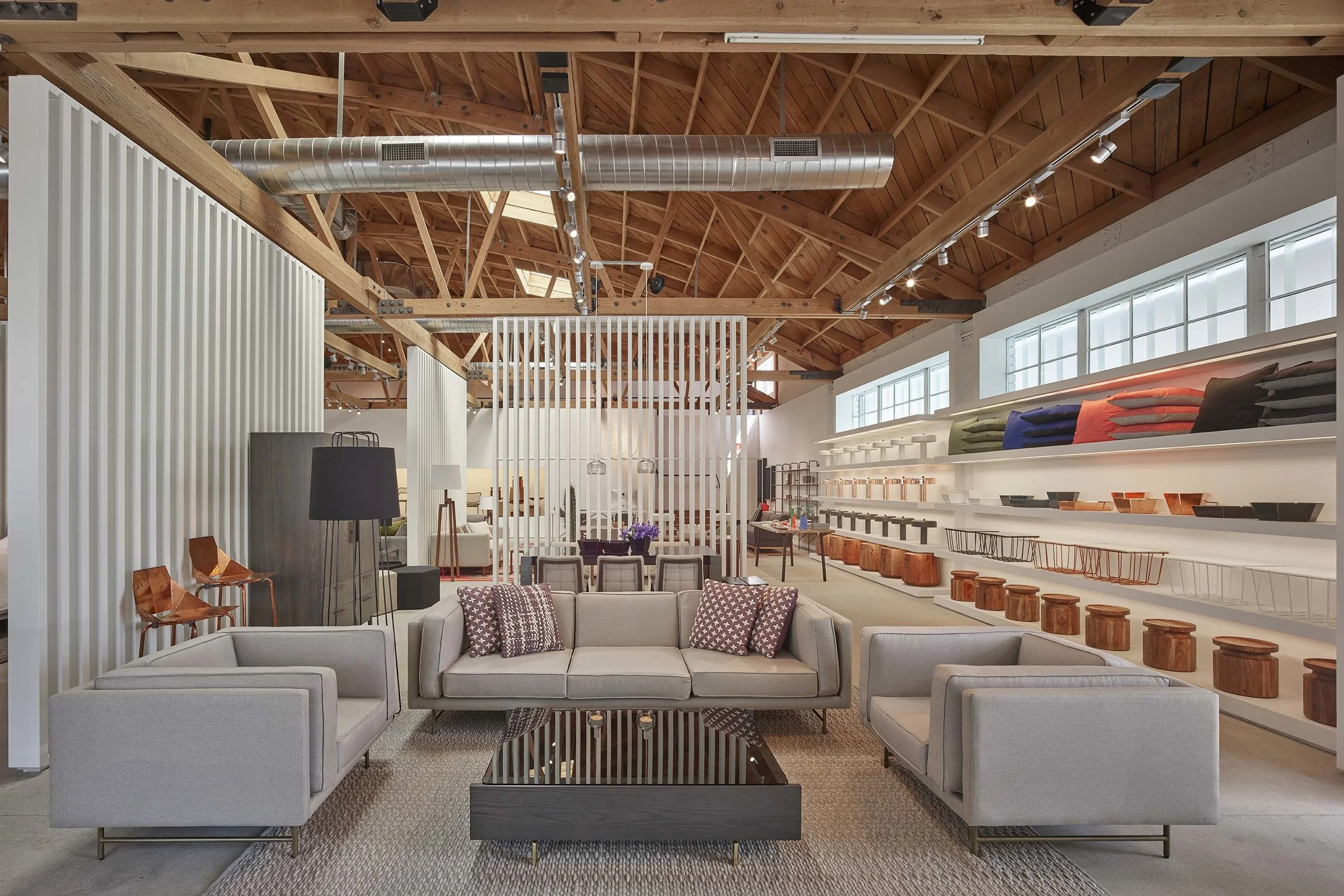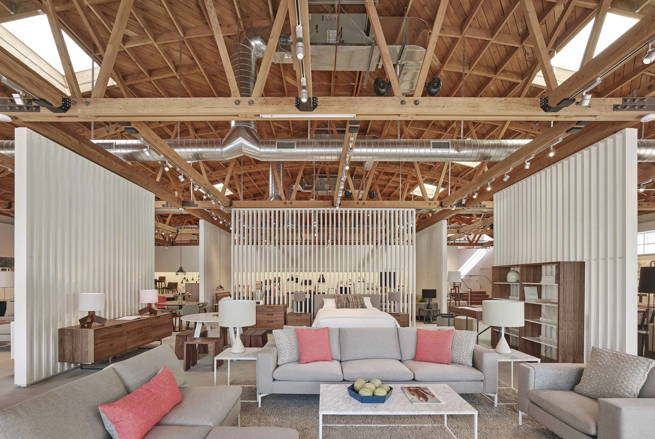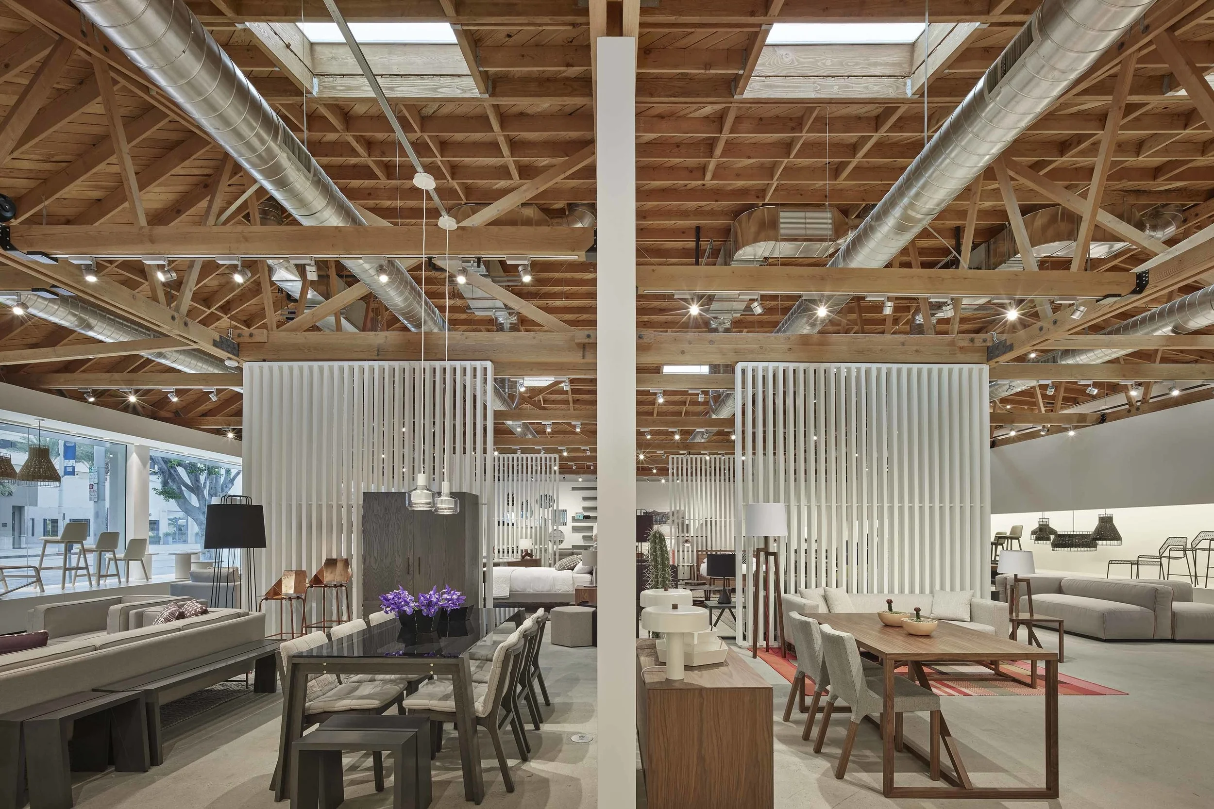 Inside the 5,000-square-foot retail space, vertical slatted screens frame intimately scaled vignettes and create dynamic and free-flowing spaces. Rhythmically staggered beams span between the existing bowstring trusses to provide lighting throughout. At the perimeter of the space, indirectly lit display shelves and a recessed display niche line the walls. A new walnut cold stair invites customers to the mezzanine.