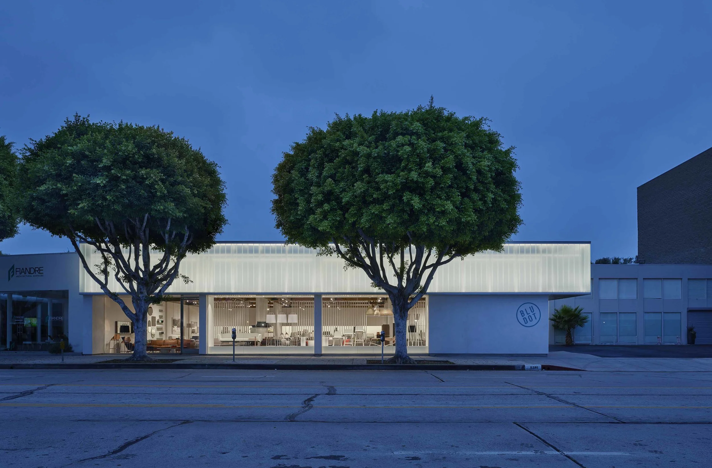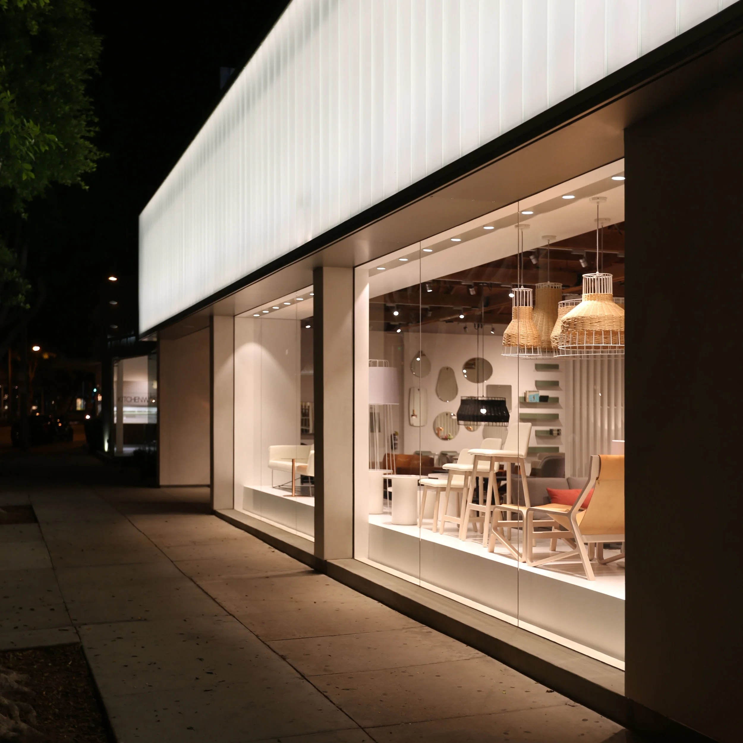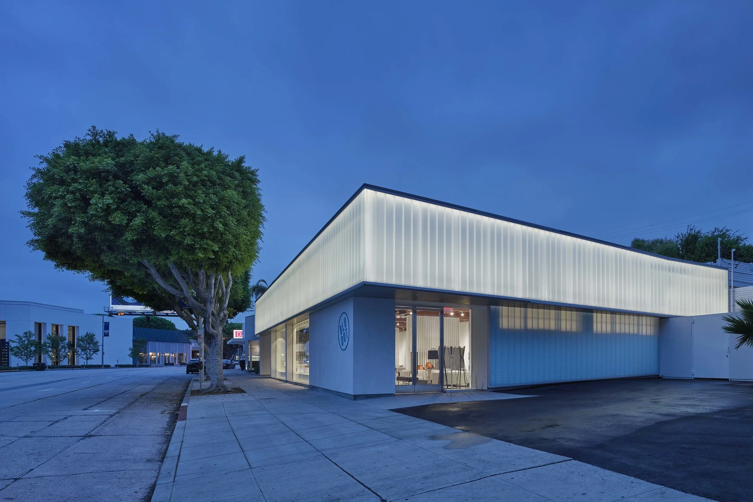 A new channel glass canopy is suspended from the façade of an existing warehouse building along Beverly Boulevard. At day, it is illuminated by sunlight that filters from behind, and at night by concealed linear LEDs. The existing façade was simplified with new elements including frameless glass and stainless steel framed entry doors. A second entry door was added to invite pedestrians to enter from both sides.