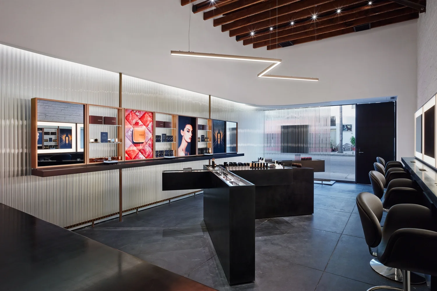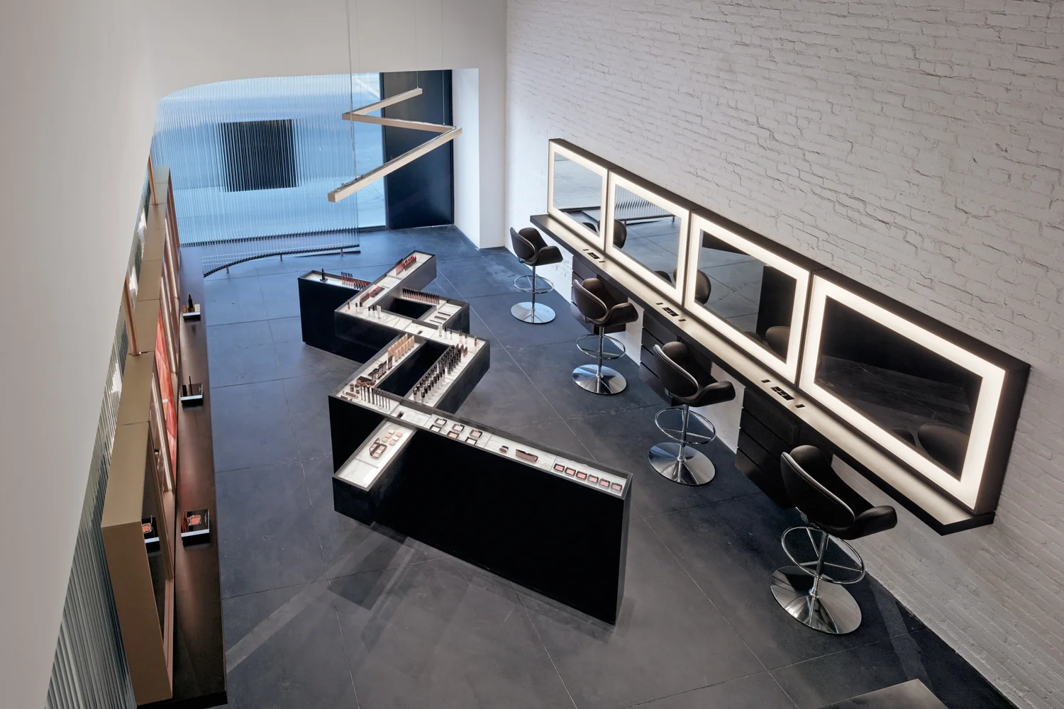The centerpiece of the store is an interwoven zigzag-shaped display fixture with black Corian walls and sloped Calcatta marble counters on which the cosmetics collection is displayed. A suspended custom LED light fixture above follows the shape of the counter.