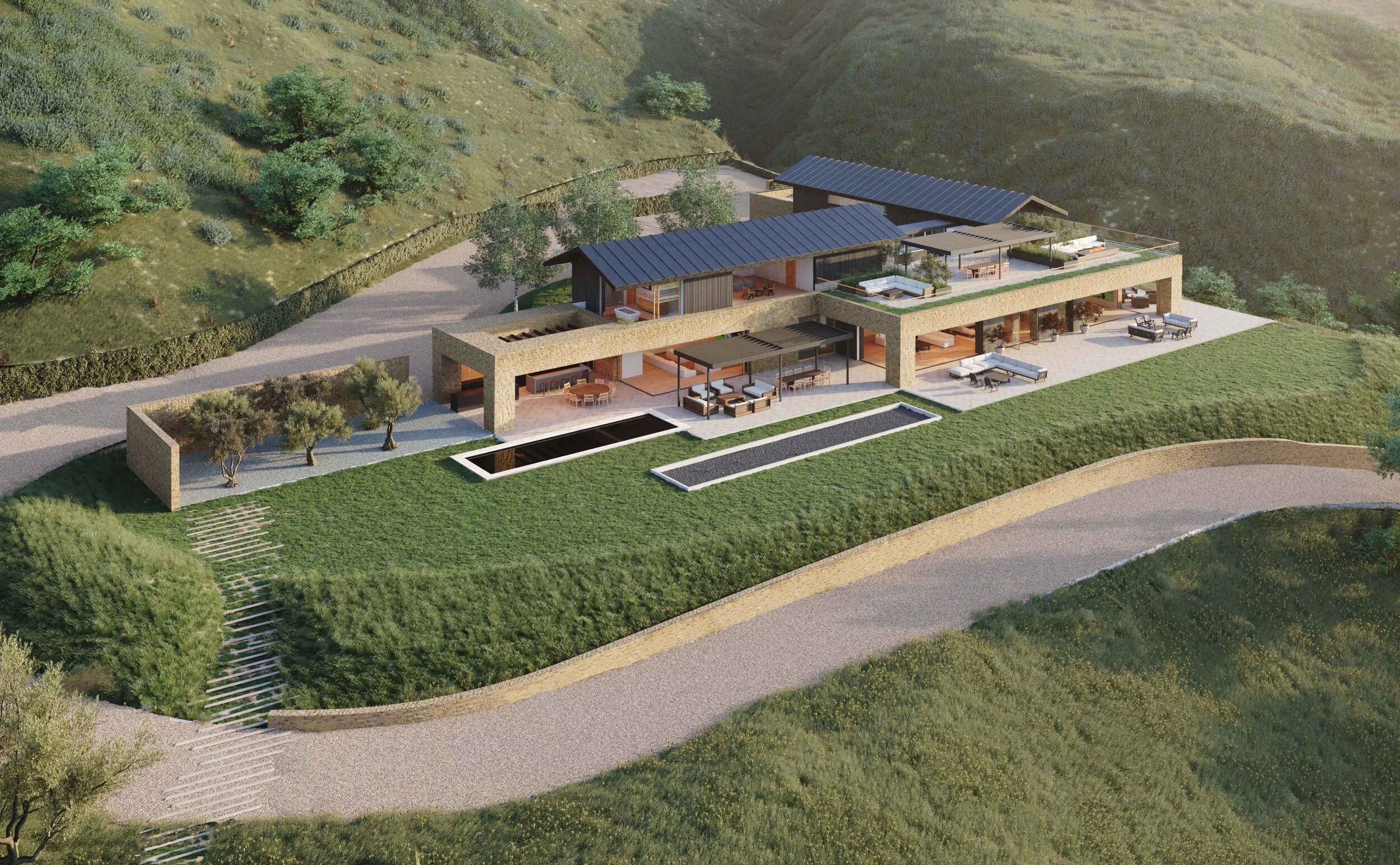The ground floor is clad with split-faced limestone, the exterior of the upper floor contrasts with dark-stained wood siding and a dark standing-seam metal roof. The new residence is complemented by a guesthouse, tennis court, infinity pool, horse stables, riding ring, and outdoor living spaces.